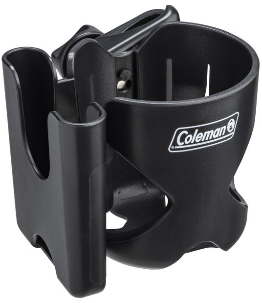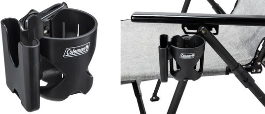 「カップホルダー」は、コールマンのボトル(水筒)類やペットボトルなどだけでなく、スマートフォンも置けるドリンク用ホルダーです。コールマンのチェアのアームレスト、ワゴンやテーブルのフレームなど、直径約1~3.5cmのフレームやポールに取り付けて、飲み物やスマートフォンを置いておくことができます。