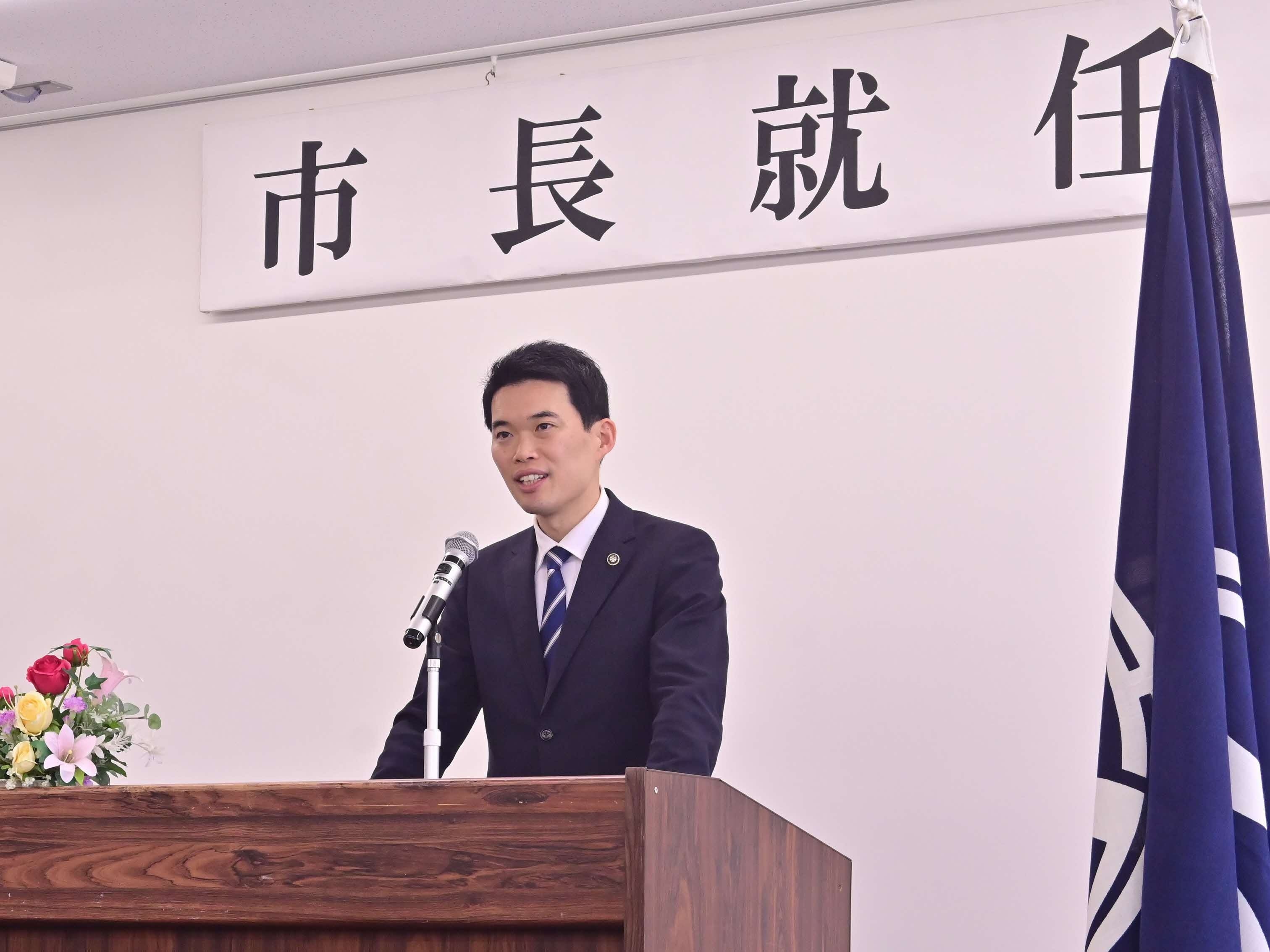 登庁後は就任式および記者会見が行われ、今後の意気込みや市政運営について語りました。