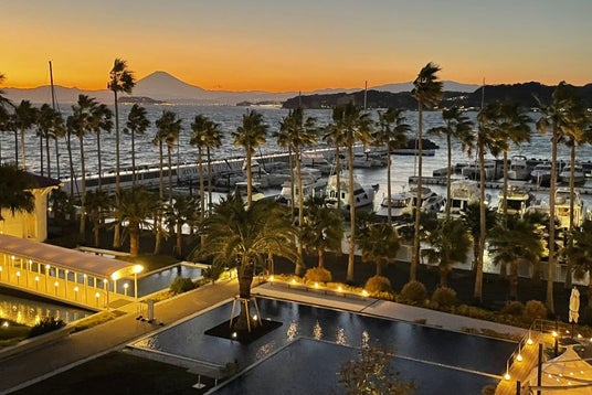 【マリブファーム】ヤシ並木、ハーバー、海、富士山を望むテラス席