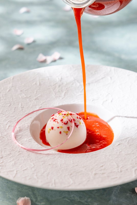 桜とピスタチオのムース あまおうのプレミアムソース仕立てプレミアムプラン限定。桜のやさしい香りをまとったムースに、コクのあるピスタチオを重ね、あまおうのジューシーな果汁を甘いスープ仕立てで。