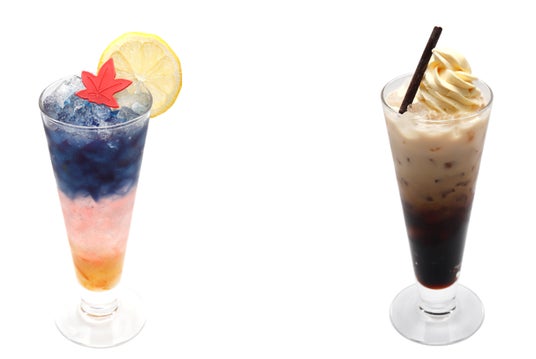 <月詠の満月バタフライピーソーダ> <土方のマヨラーコーヒーフロート>