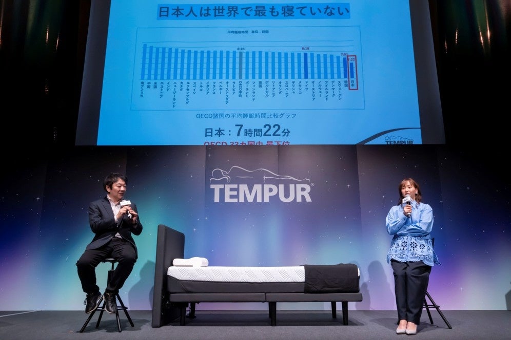筑波大学教授の櫻井武先生とタレントの藤本美貴さんによるトークセッションでは、「睡眠の質」をテーマに議論が交わされました。櫻井教授は、日本人の睡眠時間がOECD加盟国で最短であることや、睡眠不足による日本の経済損失が年間約15兆円に上るデータを示しました。