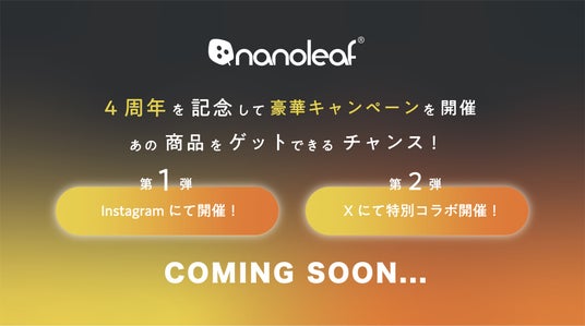 4周年を記念いたしまして、X(Twitter)とInstagramにてプレゼントキャンペーンを開催いたします。豪華賞品が当たるチャンスですので、ぜひご参加ください。詳細は各キャンペーン開始時に、Nanoleaf 公式X(@NanoleafJP)またはInstagramアカウント(@nanoleafjp)にてアナウンスいたします。
