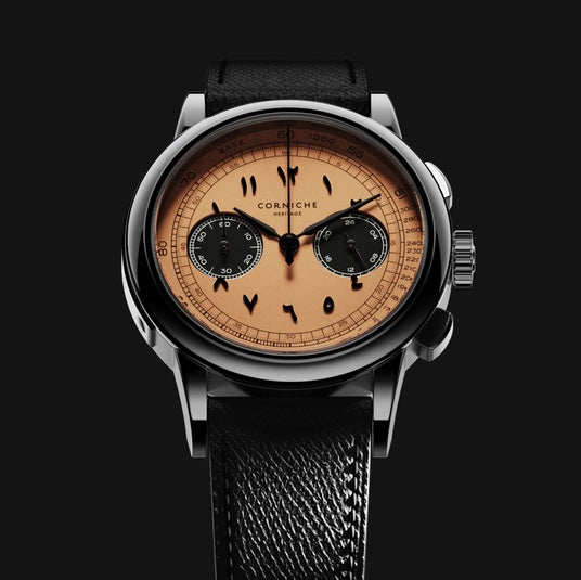 本モデルは、わずか250本のみ生産されるリミテッドエディション。すべての個体にシリアルナンバーが刻印される、特別仕様となっています。最大の特徴は、温かみのあるサーモンダイヤルに堂々と配されたアラビア語の数字インデックスです。ポリッシュ仕上げの立体的なアプライド仕様により、光を受けて美しく輝き、クラシックでありながら力強い印象を演出。ブラックの“パンダ”サブダイヤルとのコントラストが視認性を高め、デザインに明快なリズムを与えています。マッチングされた針とともに、実用性と存在感を兼ね備えたフェイスを完成させました。