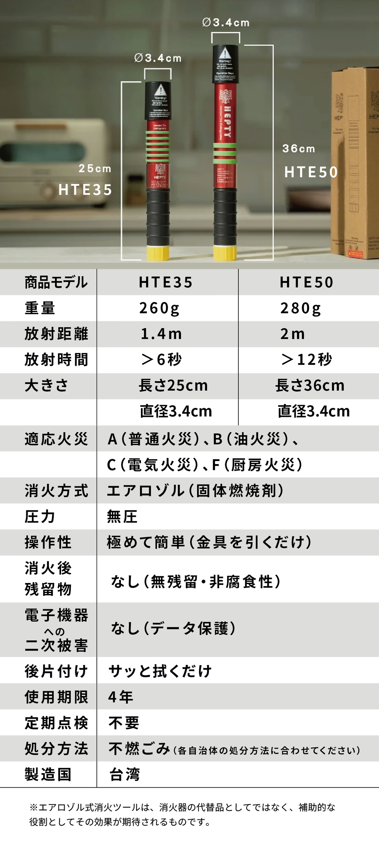 HTEシリーズは独自の無圧式磁力起動システムを採用し、内部に高圧ガスを一切使用していません。これにより、夏の高温になる車内(60℃以上)やキッチン周りでも爆発・暴発のリスクが極めて低く常備いただけます。