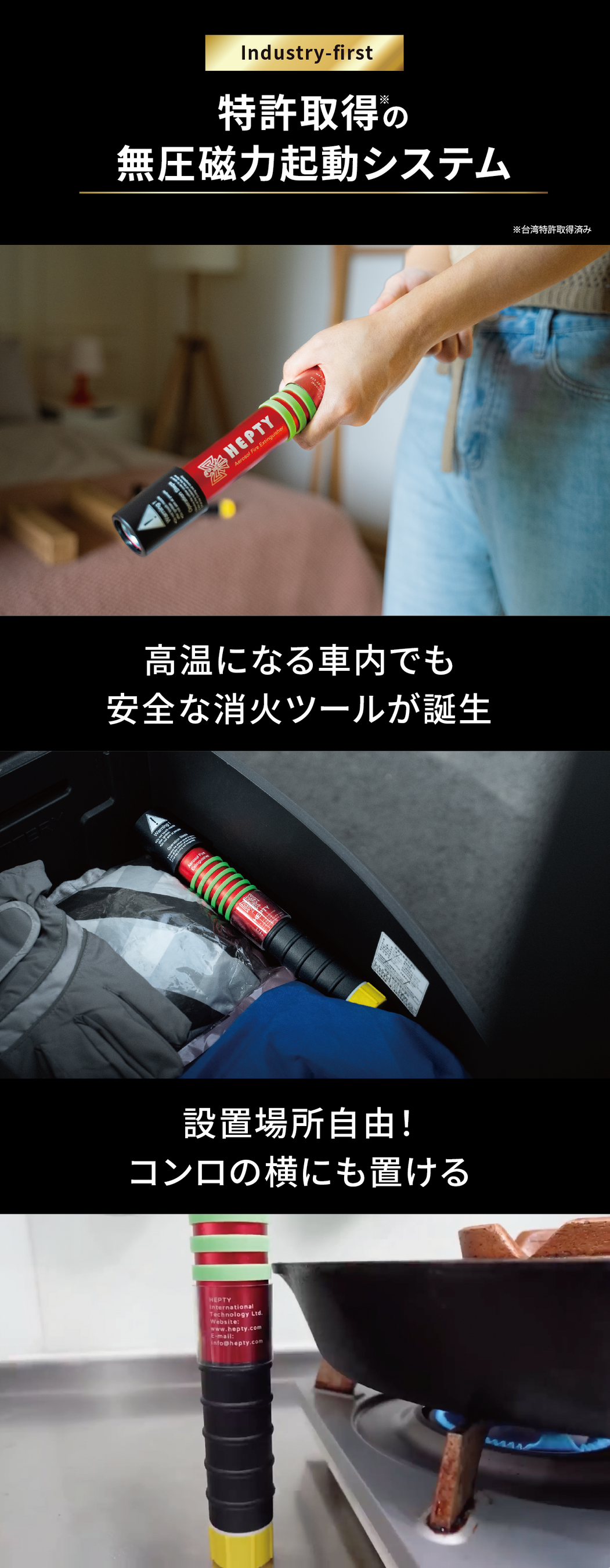 HTEシリーズは、従来の高圧式消火器が抱えるリスクや扱いづらさに着目し、圧力なしの磁気起動システムを採用した消火ツールです。これにより、熱や振動などによる爆発リスクを抑える設計を目指し、車内保管など置き場所の自由度にも配慮しました。
