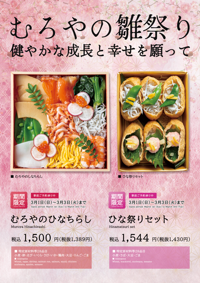 今年は、鮮やかなモザイク仕立てへとリニューアルした「むろやのひなちらし」を中心に、桃の節句を彩る限定商品を展開いたします。あわせて、3月4日(水)からは春限定のいなり商品も順次販売し、ひなまつりから次の季節へと続く味わいをご提案いたします。