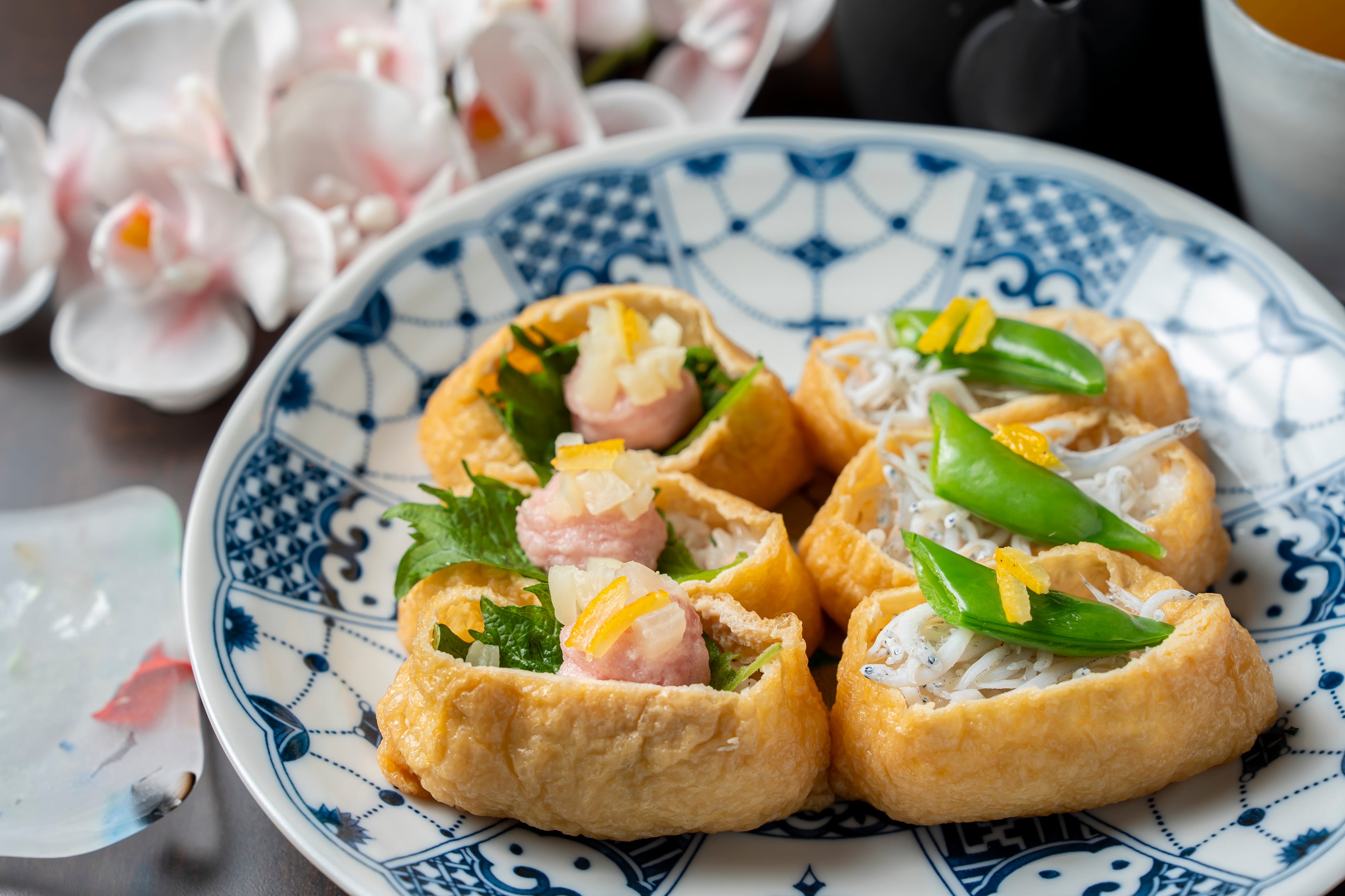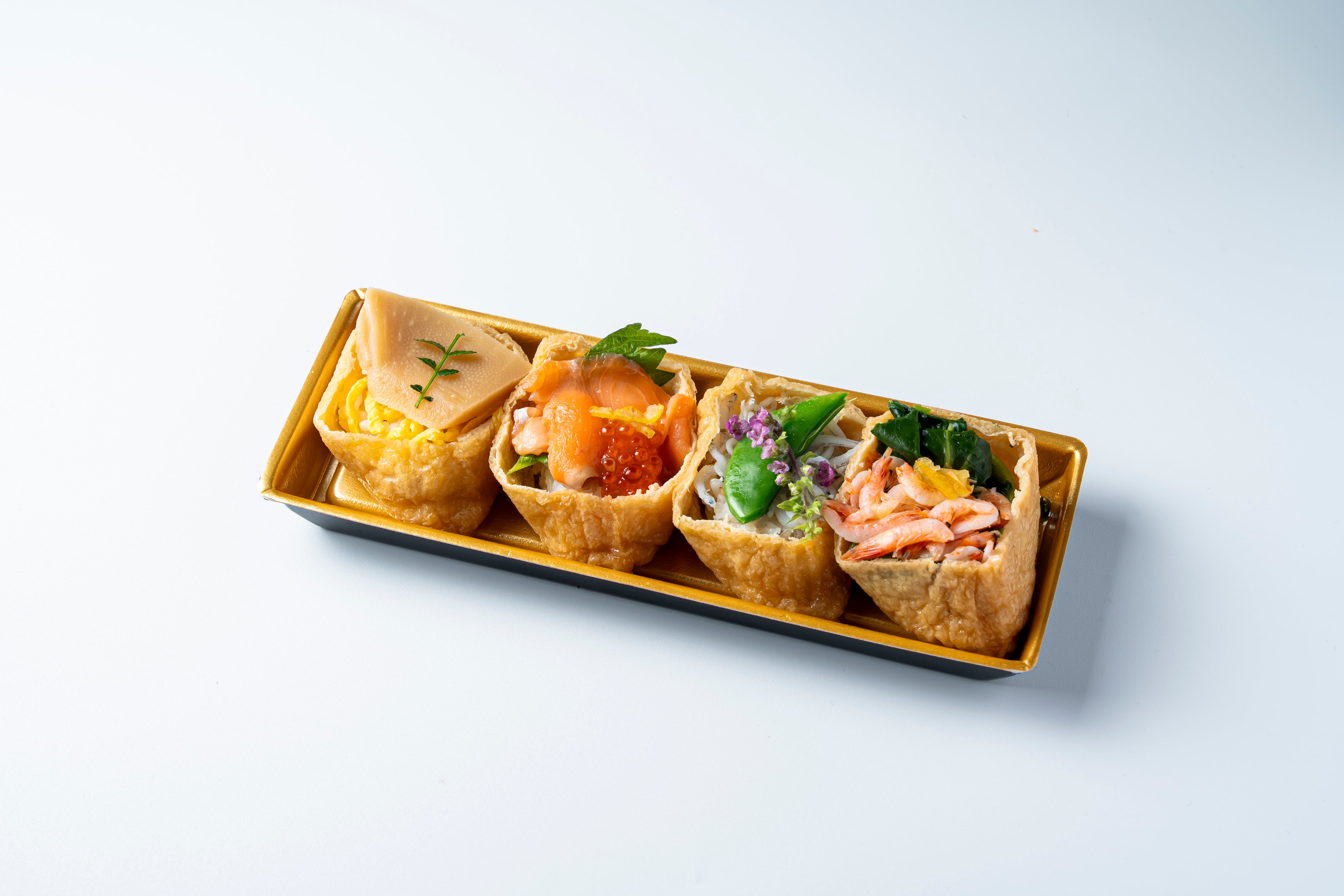 彩りや味わいの異なる4種を楽しめるセット「春爛漫いなり」。スモークサーモンの華やかさや、たけのこの軽やかな歯ごたえなど、それぞれに異なる表情を持たせています。しらすにはお好みで穂紫蘇を散らしていただき、香りのアクセントも楽しめます。