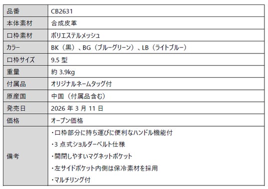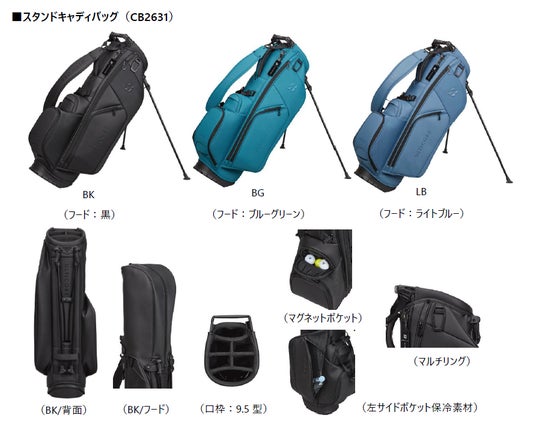 スタンドキャディバッグ(CB2631)は、快適な持ち運びと使い勝手に配慮した機能を搭載しています。持ち運びに便利な口枠部分のハンドル機能や開閉しやすいマグネットポケット、左サイド部(内側)は保冷素材でボトル収納としても使用できます。また、タオルやポーチを吊り下げるのに便利なマルチリングも付いています。