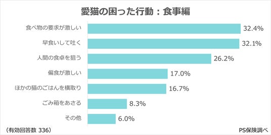 ・「食べ物の要求が激しい」(32.4%)が最多で、「早食いして吐く」(32.1%)が続く。食への執着や旺盛な食欲に、飼い主が手を焼く。