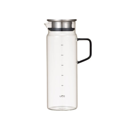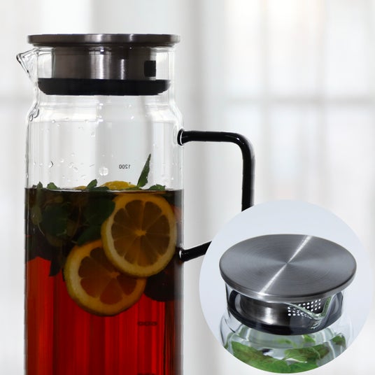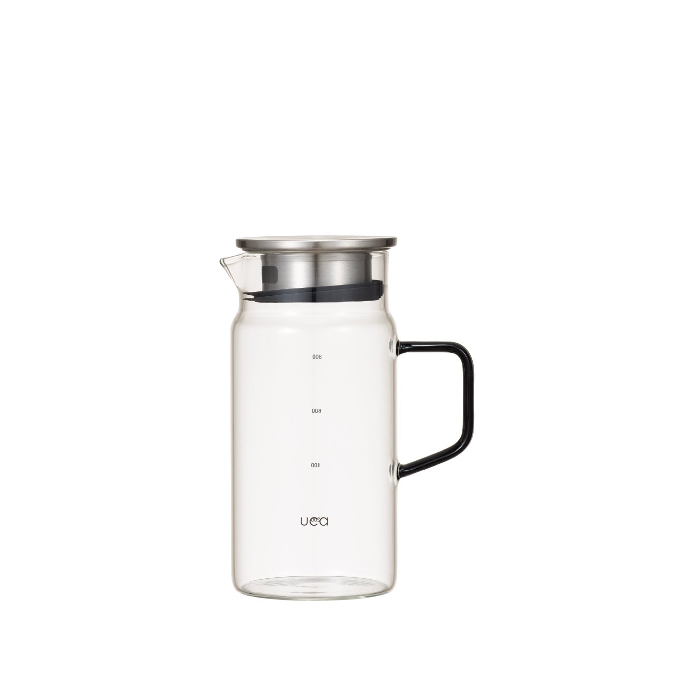 熱湯OKの耐熱ガラス、フィルター付き、手が入る広口、注ぎやすいハンドルを備えたジャグです。