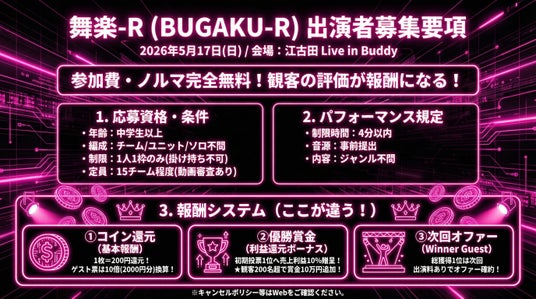 [舞楽-R実行委員会](所在地:東京都新宿区西落合、代表:松原 英明)は、2026年5月17日(日)に江古田 Live in Buddyにて、ストリートダンスイベント「舞楽-R Re.5(BUGAKU-R Re.5)」を開催いたします。 開催に先立ち、本日2026年2月18日(水)より、本イベントの趣旨に賛同し挑戦する出演ダンサー(限定15組程度)の公募を開始いたしました。