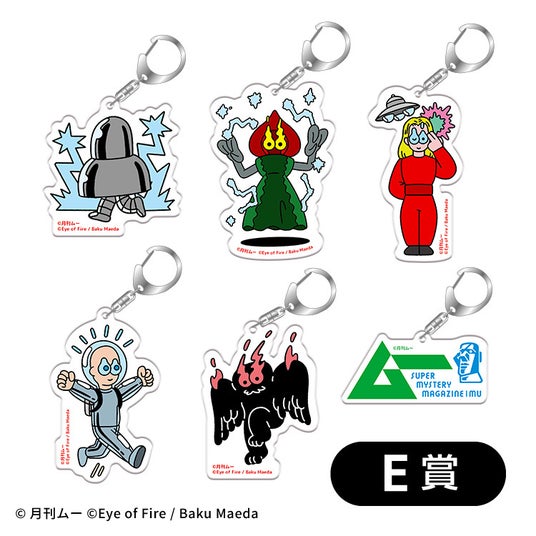 【内容】一緒にお出かけできるアクリルキーホルダーです。前田麦氏描き下ろしのUMA×宇宙人「スキンヘッドエイリアン」「フラットウッズ・モンスター」「金星人オーソン」「空飛ぶモスマン」「メタルロボットエイリアン」に、ファミマカラーの「ムー」のロゴを加えた6種から選べます。
