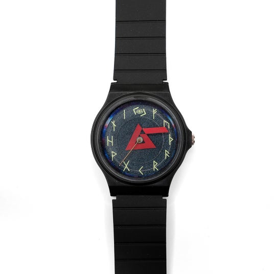 文字盤には宇宙が描かれ、古代ルーン文字の数字が記されています。「ム」が短針、「ー」が長針です。ケース背面にはプロビデンスの目が刻印されています。