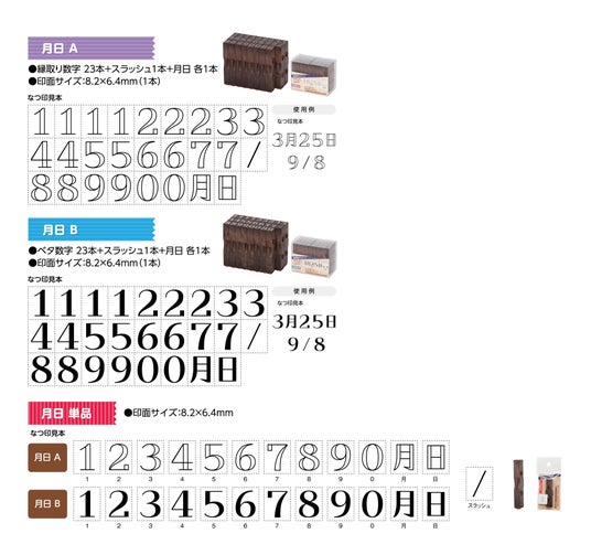 「連結数字スタンプ」は、本体の凹凸をはめ合わせて、タテヨコに連結することができる組み替え自由なスタンプです。2023年には、ノートや手帳への記録が便利にできる小さなサイズの数字「ナンバリング」と「万年カレンダー」の2タイプを発売しました。