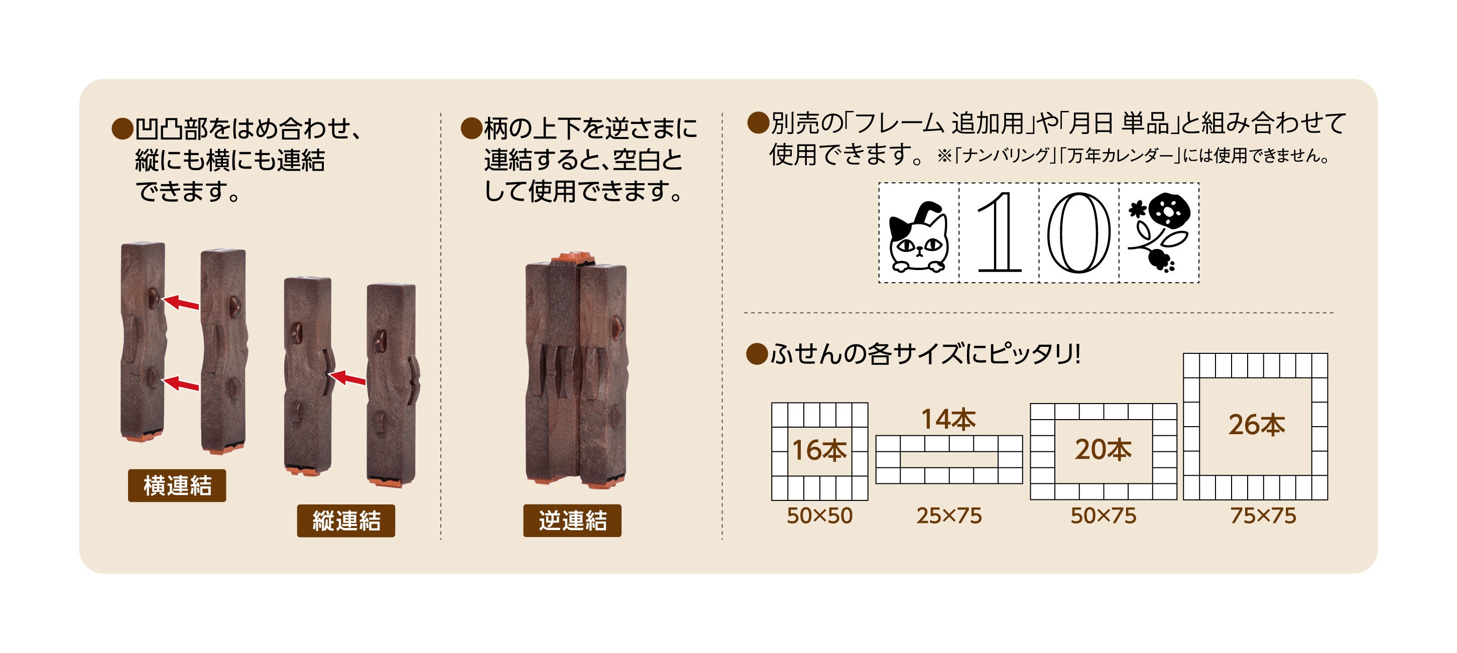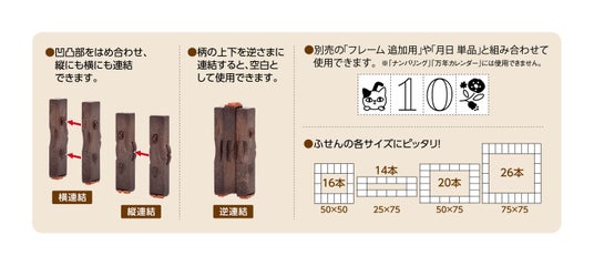 凹凸部をはめ合わせることにより、縦にも横にも連結することができます。また、ゴム印本体の上下を逆さまに連結することで、文字と文字の間に空白をつくることができます。さらに、別売の「フレーム 追加用」や「月日 単品」とも連結できます。「フレーム」は本数の増減でふせんの規格サイズとピッタリ合わせることもできます。