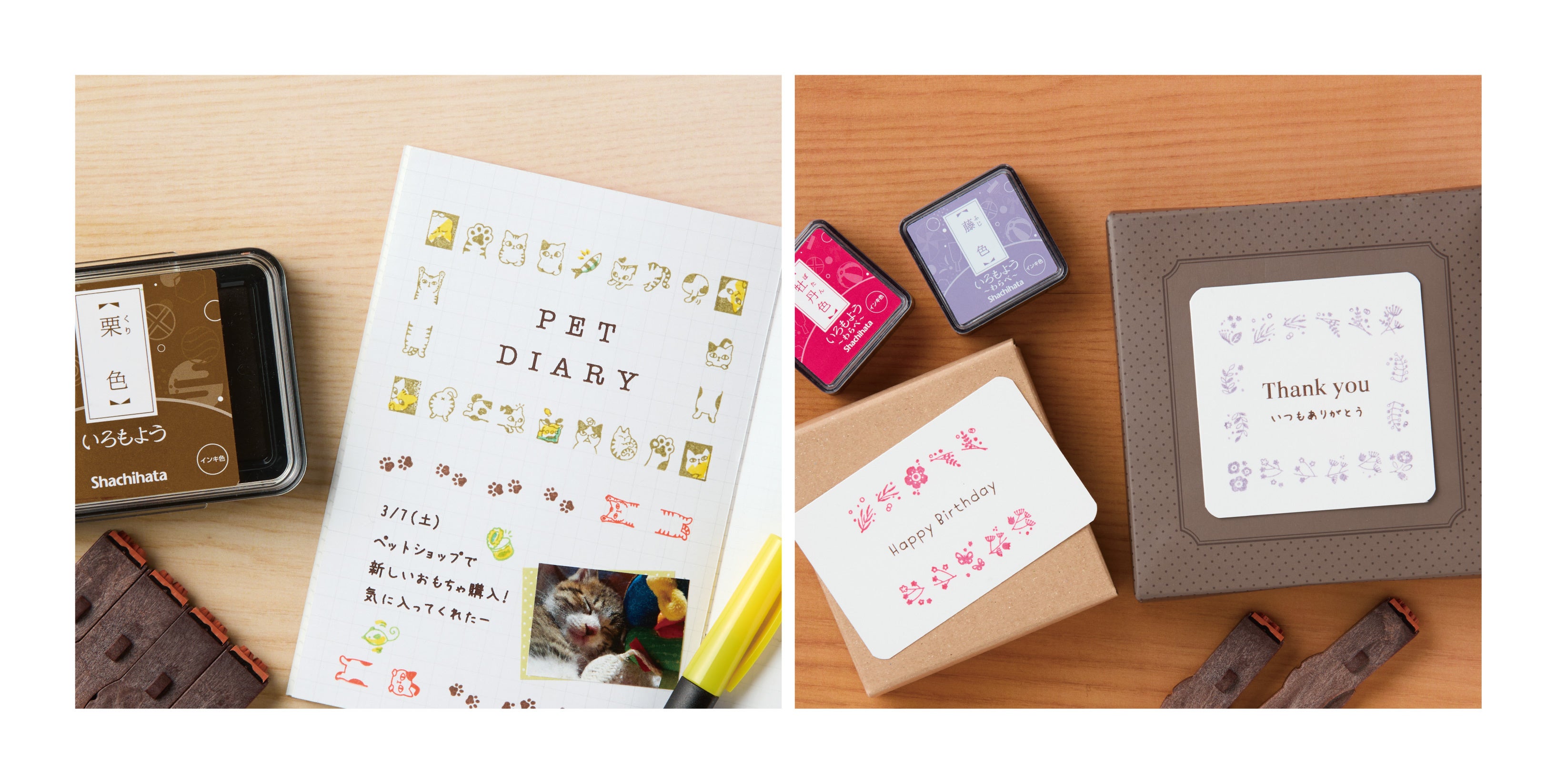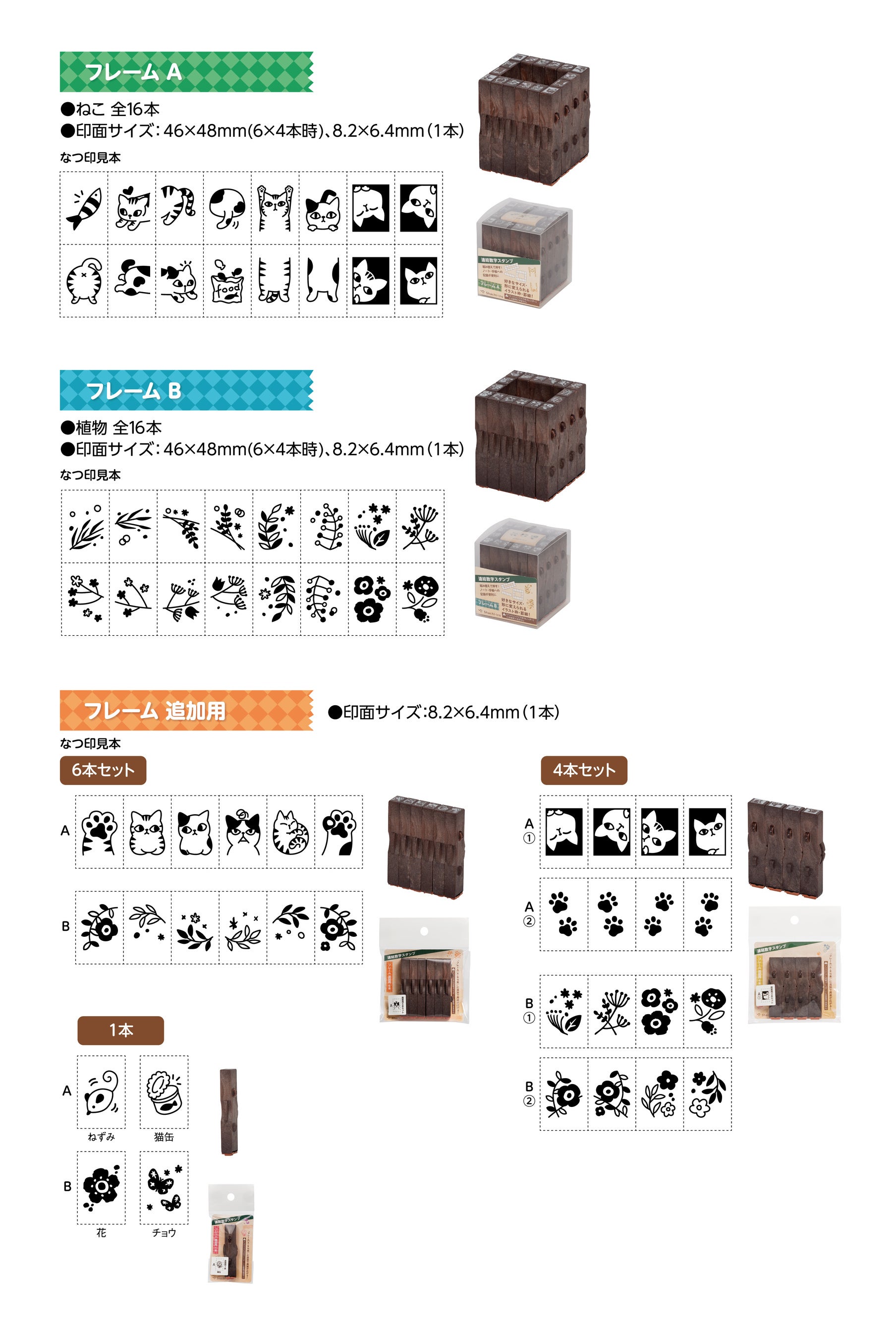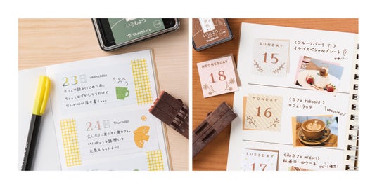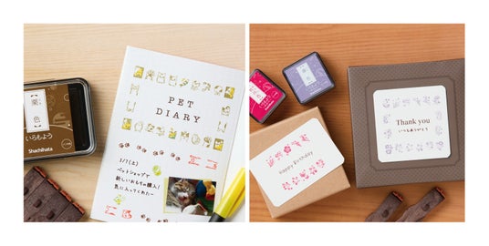 今回は、デコレーションに負けずしっかりと日付表示できる大きな数字の「月日」と、連結する本数次第で好きなサイズ・形に変えられるイラスト枠・罫線の「フレーム」が仲間入り。昨今の「手帳デコ」「ノートデコ」「コラージュ」の盛り上がりに合わせ、いろもようシリーズのスタンプパッドを活用してデコレーションを楽しめるゴム印として商品化しました。「月日」は、0~9までの数字に加え、「月」「日」「/」の記号がセットになっており、「縁取り数字」と「ベタ数字」の使いやすい2タイプの文字からからお選びいただけます。「フレーム」は生き生きとしたポーズが愛らしい「ねこ」と、さりげなく組み合わせやすい「植物」の2種類の柄をご用意。ふせんの各サイズに合わせてご使用いただけます。