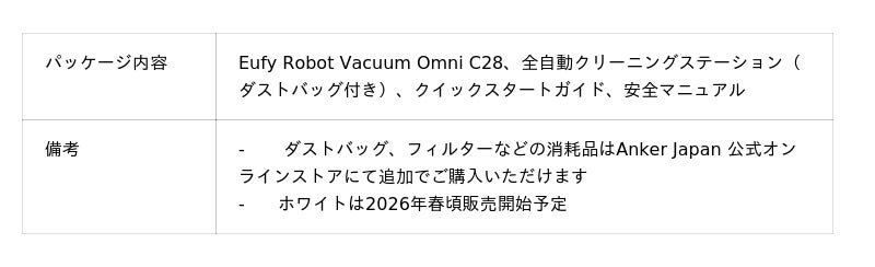米国・日本・欧州を中心にデジタル関連製品でトップクラスの販売実績を誇るAnkerグループの日本法人、アンカー・ジャパン株式会社(本社:東京都港区、代表取締役CEO:猿渡 歩)は、スマートホームブランド「Eufy(ユーフィ)」において、全自動ロボット掃除機「Eufy Robot Vacuum Omni C28」をAnker Japan 公式オンラインストア(特設ページ:https://www.ankerjapan.com/pages/eufy-c28)、直営店 Anker Store、総合オンラインストアAmazon.co.jp(製品ページ:https://www.amazon.co.jp/dp/B0FX7M29RP)、楽天市場(製品ページ:https://item.rakuten.co.jp/anker/t211a/)および一部家電量販店にて2026年2月24日(火)より販売を開始いたします。