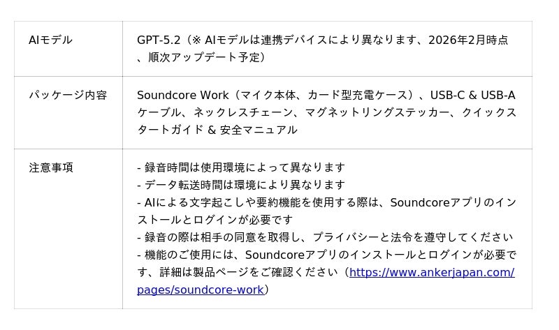 米国・日本・欧州を中心にデジタル関連製品でトップクラスの販売実績を誇るAnkerグループの日本法人、アンカー・ジャパン株式会社(本社:東京都港区、代表取締役CEO:猿渡歩)は、オーディオ&ビジュアルブランド「Soundcore」において、AIボイスレコーダー「Soundcore Work」を2026年2月18日(水)よりAnker Japan 公式オンラインストア(特設ページ:https://www.ankerjapan.com/pages/soundcore-work)、直営店 Anker Store、総合オンラインストアAmazon.co.jp(製品ページ:https://www.amazon.co.jp/dp/B0FKN8FYV1)、楽天市場(製品ページ:https://item.rakuten.co.jp/anker/d3200/)および一部家電量販店等において予約販売を開始いたします。