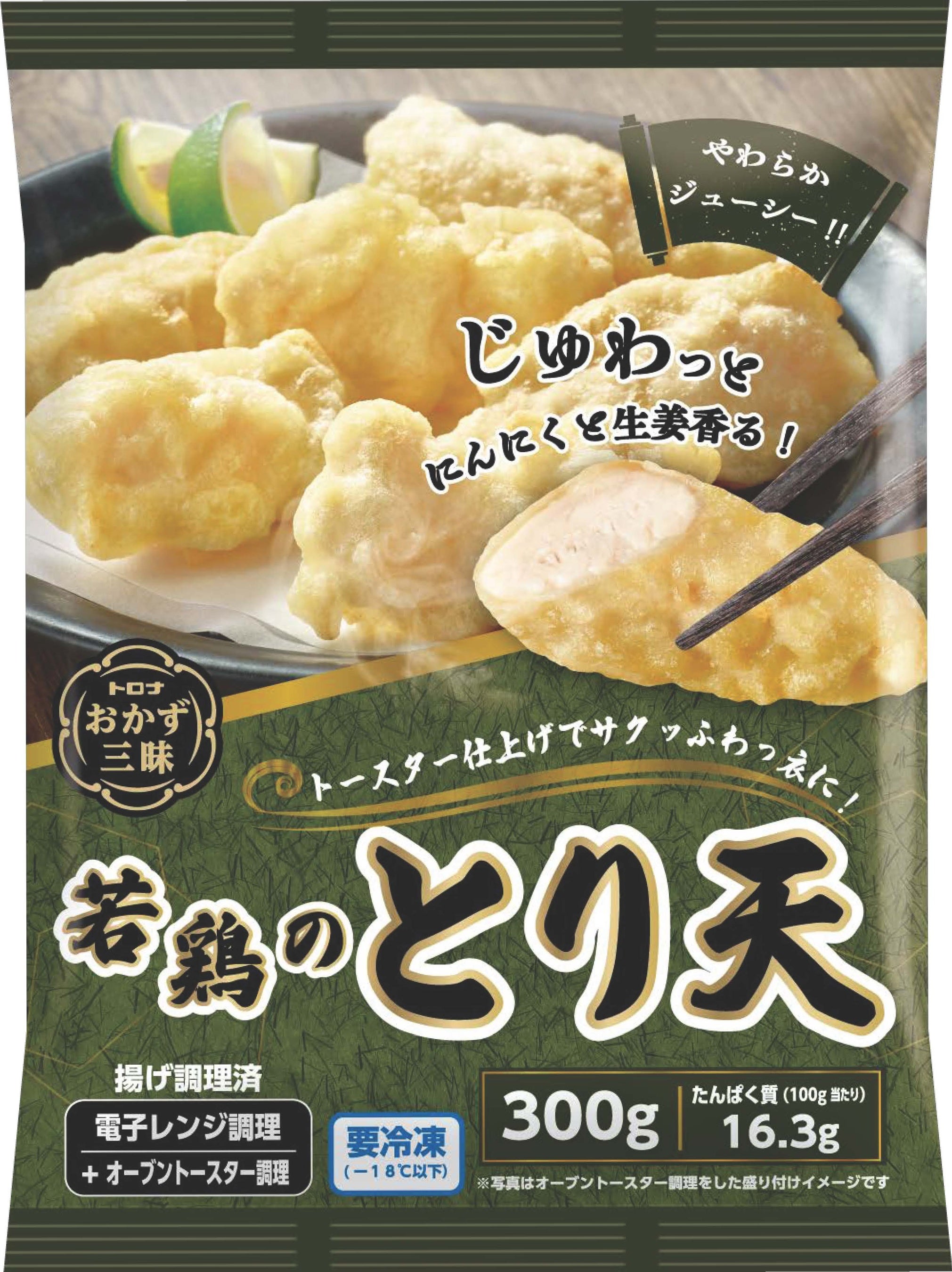 ニンニクと生姜の風味が鶏肉の旨みを引き立てるとり天です。若鶏のむね肉の柔らかくジューシーな食感をお楽しみいただけます。トースターで、外はサクッと中はふわっとした衣に仕上げていただくのがおすすめです。