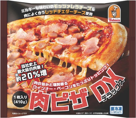 ボリューム感のあるもっちり生地に、粗挽き肉のミートソース、肉の旨みと燻製の香りを楽しめるウインナーとベーコンをたっぷりトッピングした食べ応え抜群の肉を味わうピザです。ミルキーなモッツァレラ、コクのあるレッドチェダーが肉の旨みとマッチします。当社が販売している10インチ(約25cm)規格のピザとの平均肉重量比で約20%増のDX(デラックス)なボリュームのため、宅配ピザのようにシェアしながらご家庭で楽しめます。
