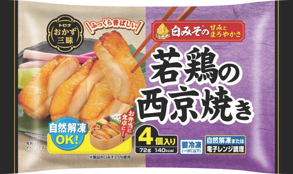 ジューシーな鶏もも肉を使った若鶏の西京焼きが、自然解凍対応になりました。西京みその甘みと、香ばしい風味がごはんと相性抜群です。