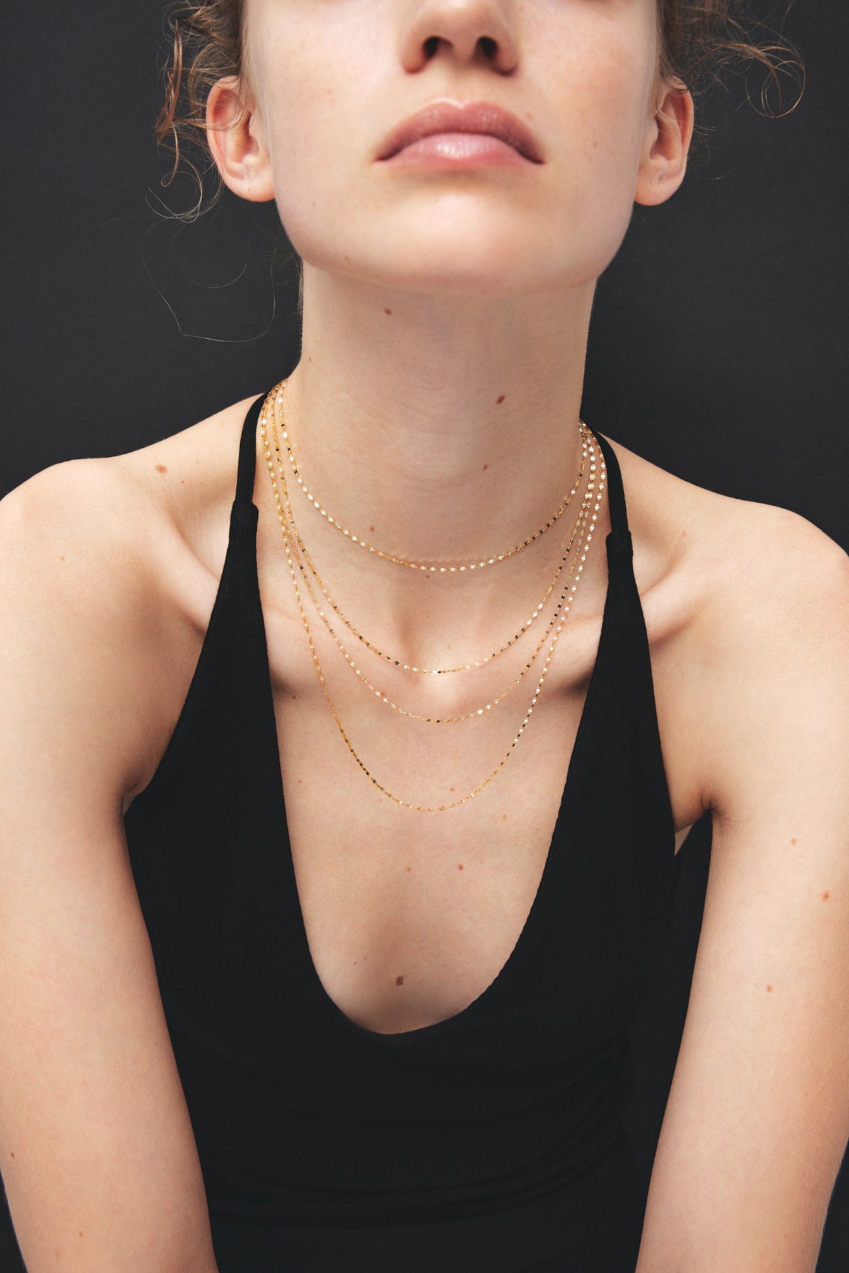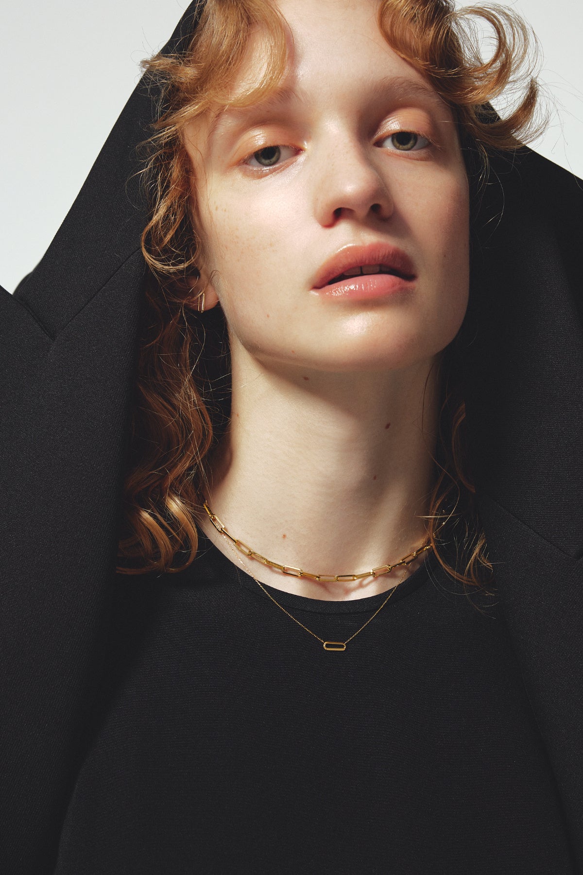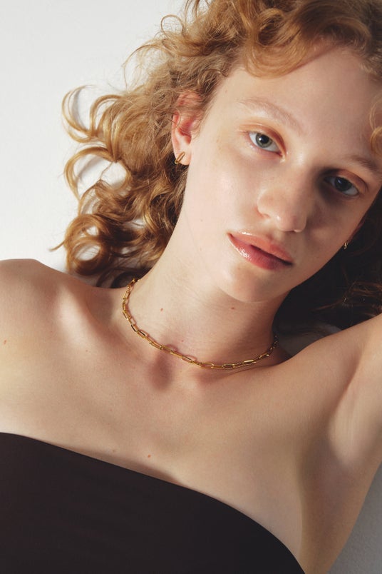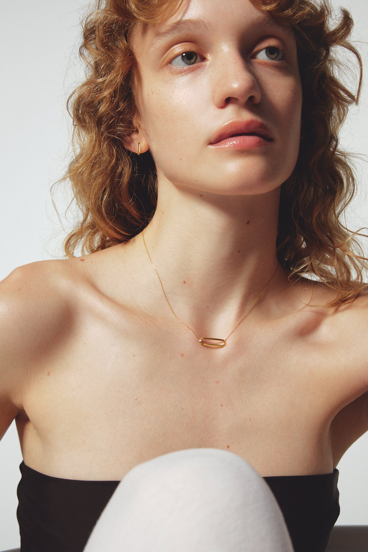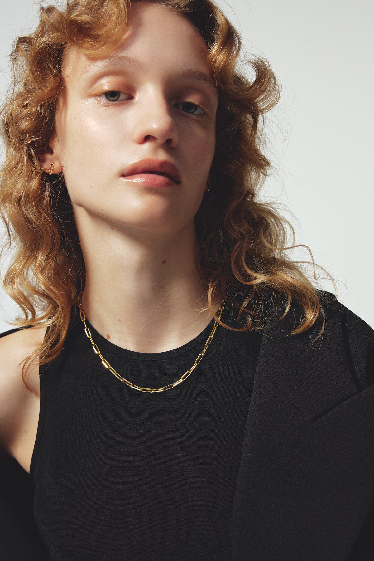 首元に寄り添うシャープな曲線は、ゴールドチェーンと好相性。