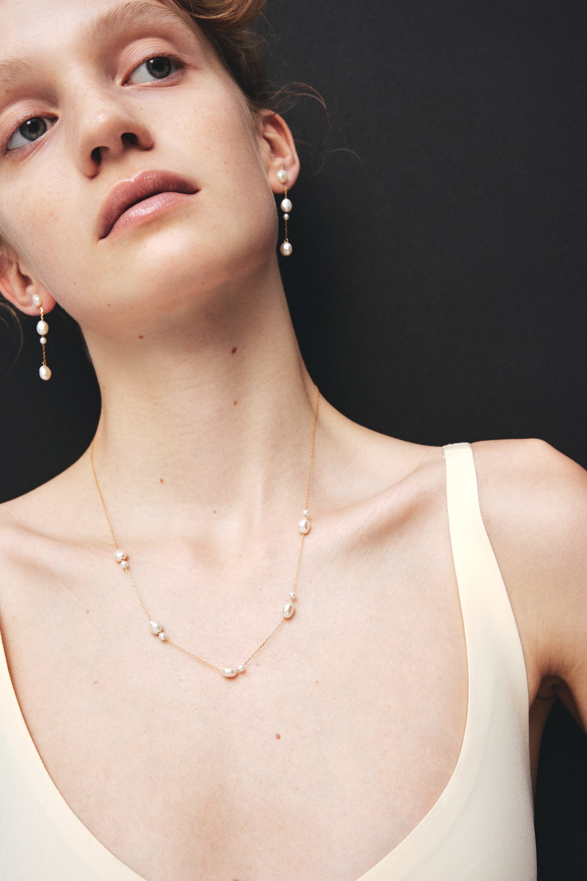 鎖骨のそばに収まる40cm。パールと肌が調和するように馴染み、表情にしなやかな印象を与えます。