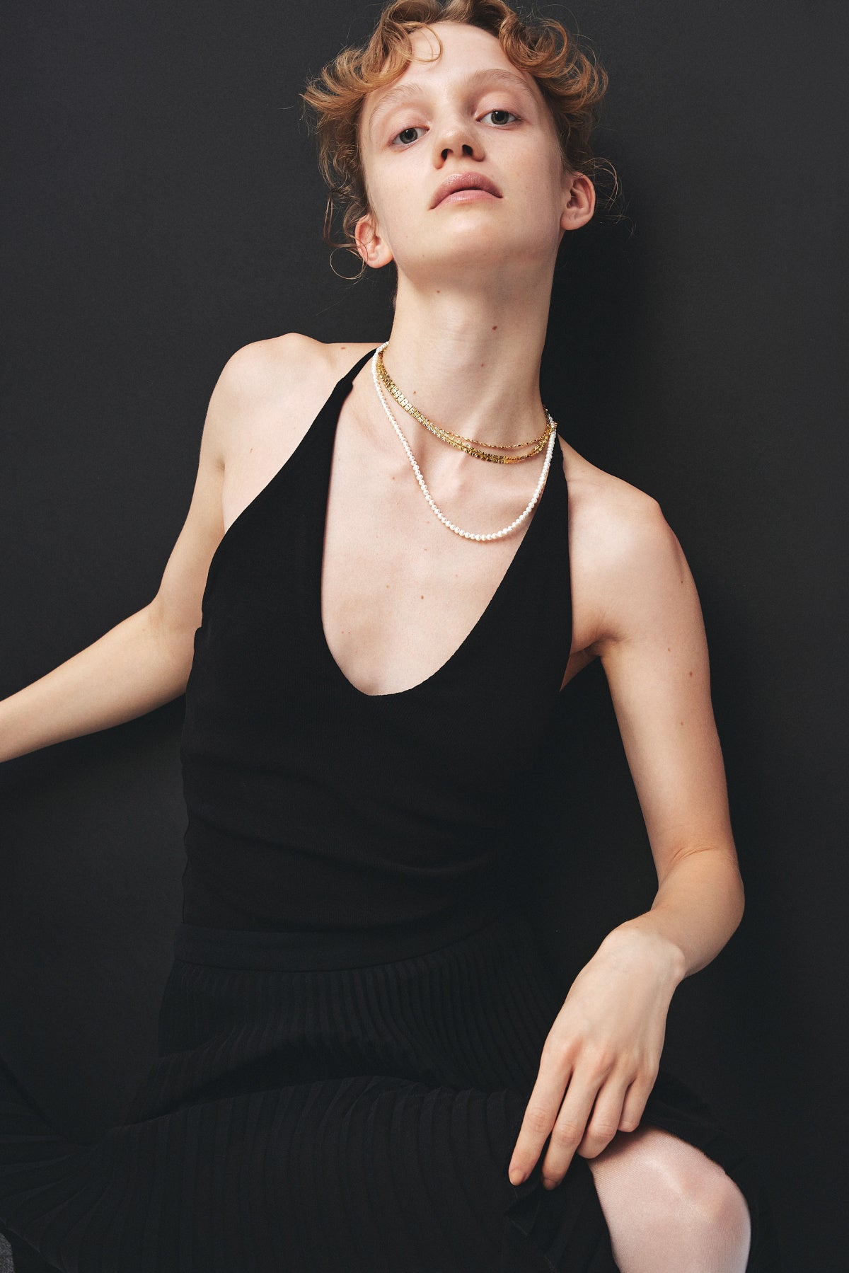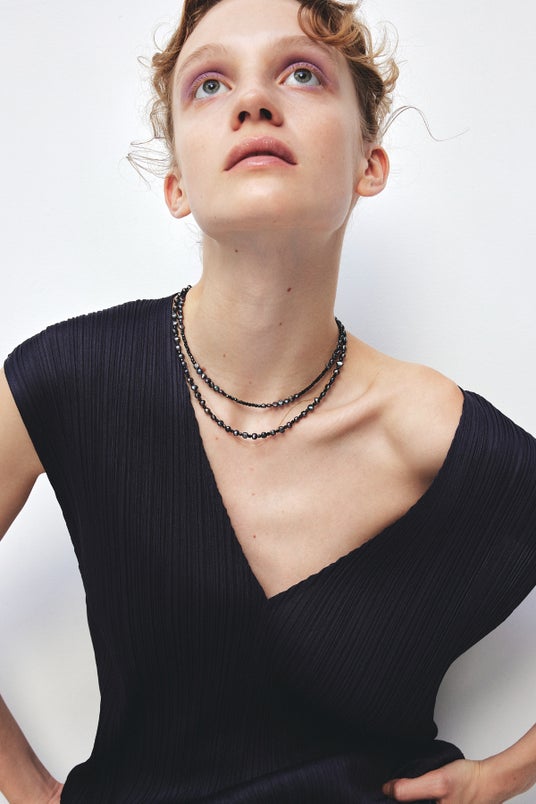 デコルテに沿って美しく収まり、スタイル全体をシャープに引き締めます。