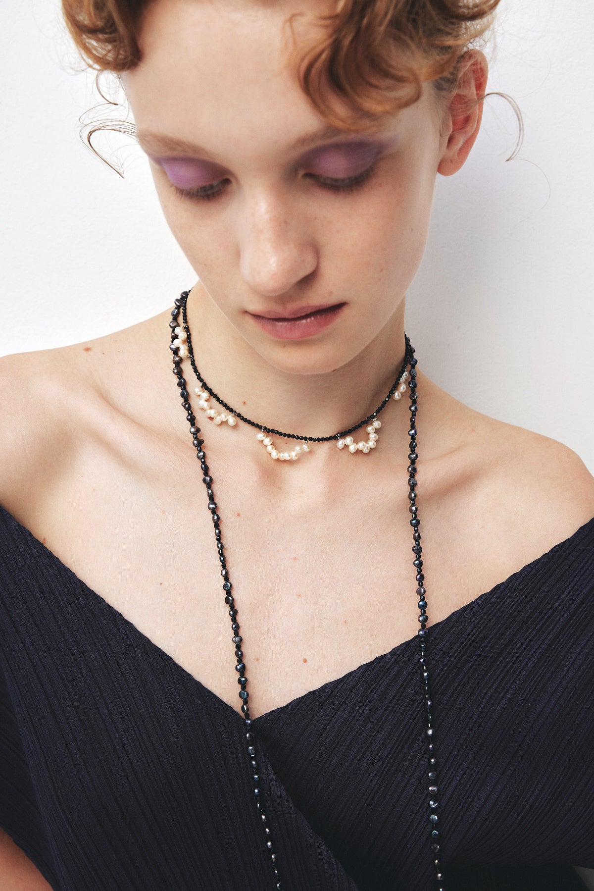 ブラックスピネルと淡水パール、異なる質感が交差するネックレス。