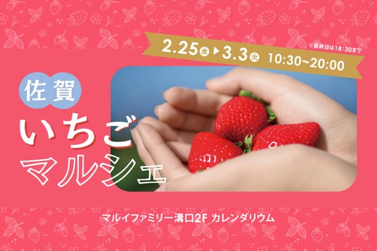 マルイファミリー溝口(株式会社丸井、本社:東京都中野区、代表取締役社長:青野 真博)2Fカレンダリウムにて、産地直送ECサイト「ポケットマルシェ」を運営する株式会社雨風太陽と共催で、佐賀県のブランドいちごやいちごスイーツが勢揃いするイベント「佐賀いちごマルシェ」を2月25日(水)~3月3日(火)の期間限定で実施いたします。
