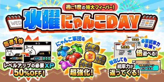ポノス株式会社(本社:京都府京都市、代表取締役:辻子依旦、以下「ポノス」)が提供するスマートフォン向けゲームアプリ『にゃんこ大戦争』が、期間限定イベント「水曜にゃんこDAY」を、2026年2月18日(水)0:00より開始いたしました。