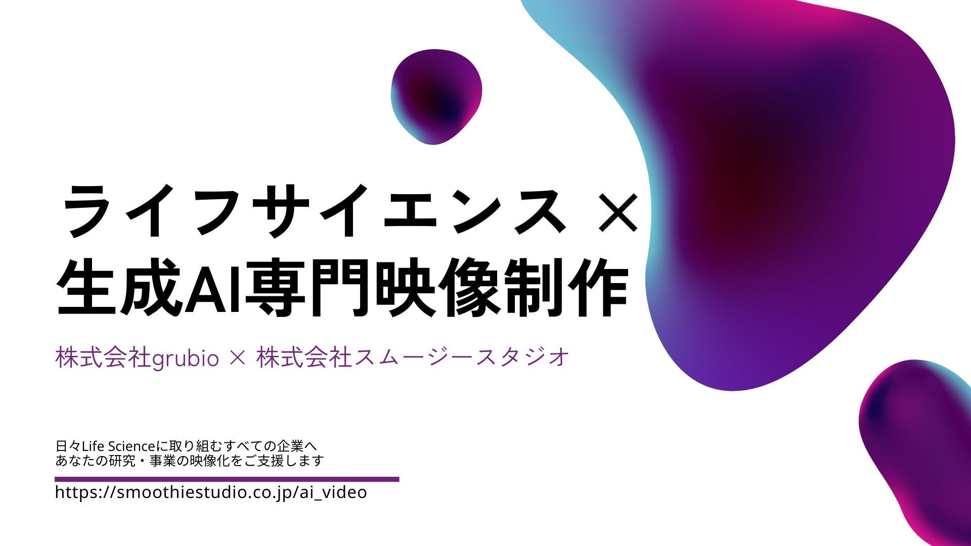 株式会社grubioは、生成AI活用型動画制作のノウハウを有する株式会社スムージースタジオと提携し、ライフサイエンス分野に特化した「ライフサイエンス × 生成AI専門映像制作」サービスを開始します。これにより、当社が推進してきたライフサイエンス領域の専門性やノウハウにスムージースタジオの生成AIのノウハウを掛け合わせ、研究成果・製品価値をわかりやすく映像化し、国内外へ発信する体制を強化いたします。