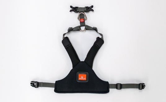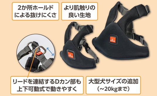 「首周り」と「胴周り」の2箇所で調整・固定する構造を採用しました。胴体をしっかりホールドするため、散歩中に愛犬が後ずさりしてもハーネスから抜けにくくなっています。