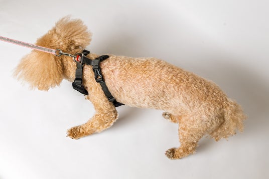 装着は「頭を通す」→「バックルを留める」のシンプルな構造。足を上げさせる必要がないため、ハーネスが苦手なワンちゃんや、飼い主さま一人でもスムーズに装着可能です。