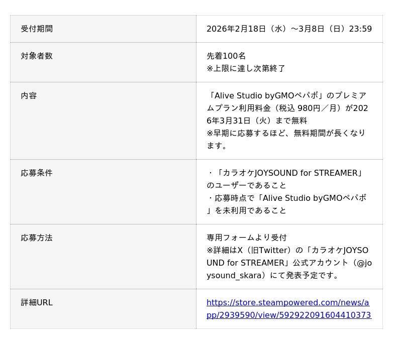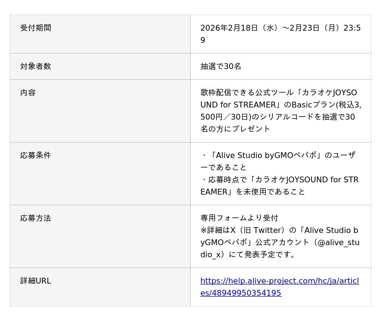 第1弾では、「カラオケJOYSOUND for STREAMER」とコラボレーションした配信用素材とエフェクトを「Alive Studio byGMOペパボ」に追加するとともに、それぞれのユーザーに対し、相互のサービスの活用を後押しする魅力的なキャンペーンを実施します。