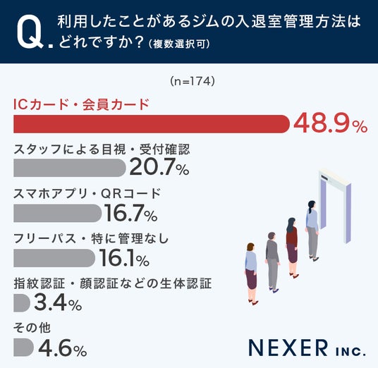 その結果、最も多かったのは「ICカード・会員カード」で48.9%と、約半数を占めました。次いで「スタッフによる目視・受付確認」が20.7%、「スマホアプリ・QRコード」が16.7%と続きます。