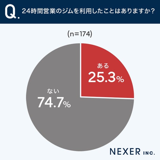 その結果「ある」が25.3%、「ない」が74.7%でした。4人に1人は、24時間営業のジムを利用した経験があることになります。