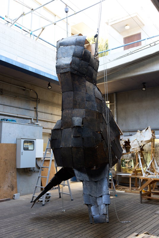 図版8. 工藤 空《大きなロバを空へ送る》(部分)木版、木炭、木材、ベニヤ板、麻紐、油性インク H3700×W1700×D1700mm