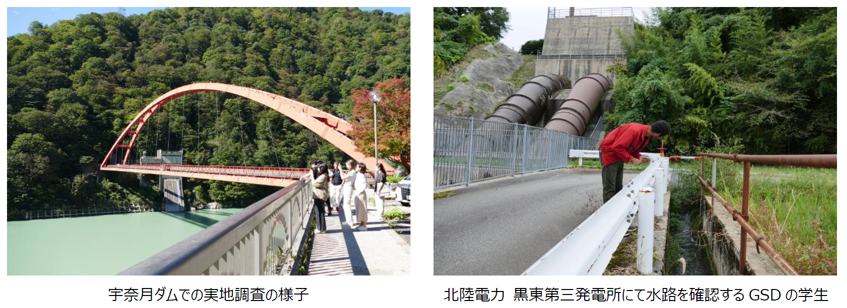 豊かな自然と持続可能な企業活動が共生する黒部では、3,000m級の立山連峰から水深1,000m以上の富山湾まで、高低差4,000mの地形が生み出すダイナミックな水資源、農業や工業、YKK不動産が取り組む風や地下水などの自然エネルギーを活用したローエネルギーな“まちづくり”をしている「パッシブタウン」を対象に、ランドスケープデザインについて学びを深めました。黒部川扇状地の調査として、宇奈月ダムや扇状地内の小規模ダム、黒部川の氾濫痕とその対策である霞堤(かすみてい)などを見学。人々のたゆまぬ努力により、かつて氾濫を起こし続けた黒部川と共存できていること、豊富な水資源を発電や農業などに活用できていることなどを確認しました。