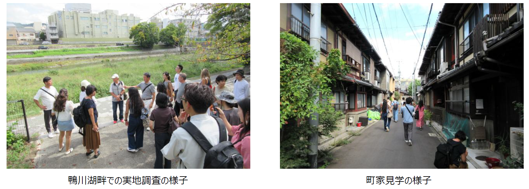 京都市の調査として、上賀茂神社・下鴨神社、深泥池、伏見運河、淀川三川合流域などを見学しました。京都市の山際、鴨川上流から下流、町家の残る住宅街など様々な場所をめぐり、歴史深い京都を舞台にランドスケープデザインについての学びを深めました。