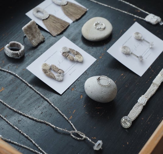 北海道発の自然や風景から着想を得て、永くお使いいただけるよう素材選びと工程にこだわっている〈harishigoto(ハリシゴト)〉。糸やヴィンテージビーズ、天然石や現代ビーズなど多様な素材を一針一針丁寧に縫い上げています。耳飾りや首飾り、腕輪や指輪などのアイテムは重ね付けも自在。身に着ける方の御守りのように寄り添う存在を目指した温もりある刺繍の刺繍装身具をご覧ください。