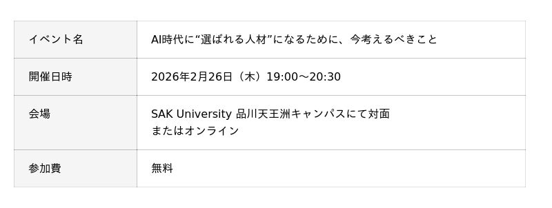 英国国立エセックス大学公認の国際教育提携校 SAK University東京イノベーションキャンパス(以下、SAK University)は、2026年2月26日(木)19時にさくらインターネット株式会社 ES本部人材企画部部長 武村 宙 氏、人材企画部 教育企画・推進グループ リーダー 前佛 雅人氏を招いた特別講演「AI時代に“選ばれる人材”になるために、今考えるべきこと」を開催します。
