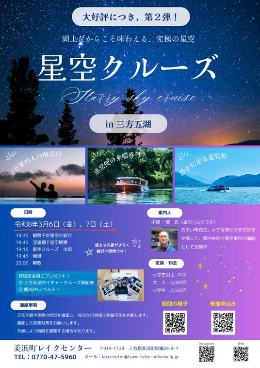 夜の三方五湖を舞台に、星空案内人と一緒に楽しむ「星空クルーズ」第2弾を開催します。町の明かりから離れた湖上で、満天の星々を眺めながら、特別な夜のクルーズをお楽しみください。