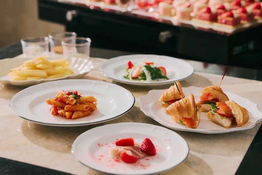 ・セイボリー:コーンポタージュスープ、生ハムいちご、ゼッポリーニ、クロワッサンサンド、いちごのミニブリニ トリュフ風味 など