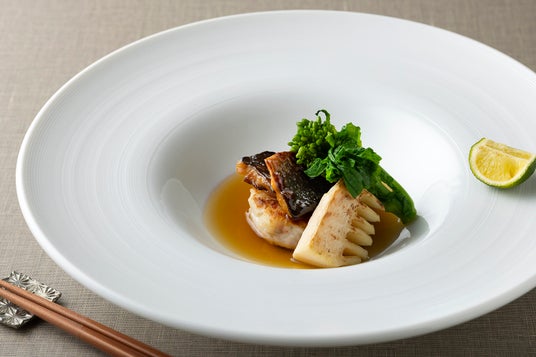 今春は、奈良県が誇る和牛「大和牛」をはじめ、シェフが奈良県の生産者を訪問し、作り手の姿勢に触れて感銘を受け、選び抜いた食材を中心にコース料理を構成いたしました。吉野晒(よしのざらし)の製法を150年以上守り続ける天極堂の吉野本葛のほか、江戸時代から天日干しの製法を受け継ぐ嘉兵衛本舗の番茶、奈良県産大豆にこだわり、在来種の豆「大鉄砲大豆」を復刻して作った豆腐や醤油、奈良県の柿を多様な加工品に仕立てる「柿の専門」の柿酢など、生産者の思いが伝わる食材を取り入れております。