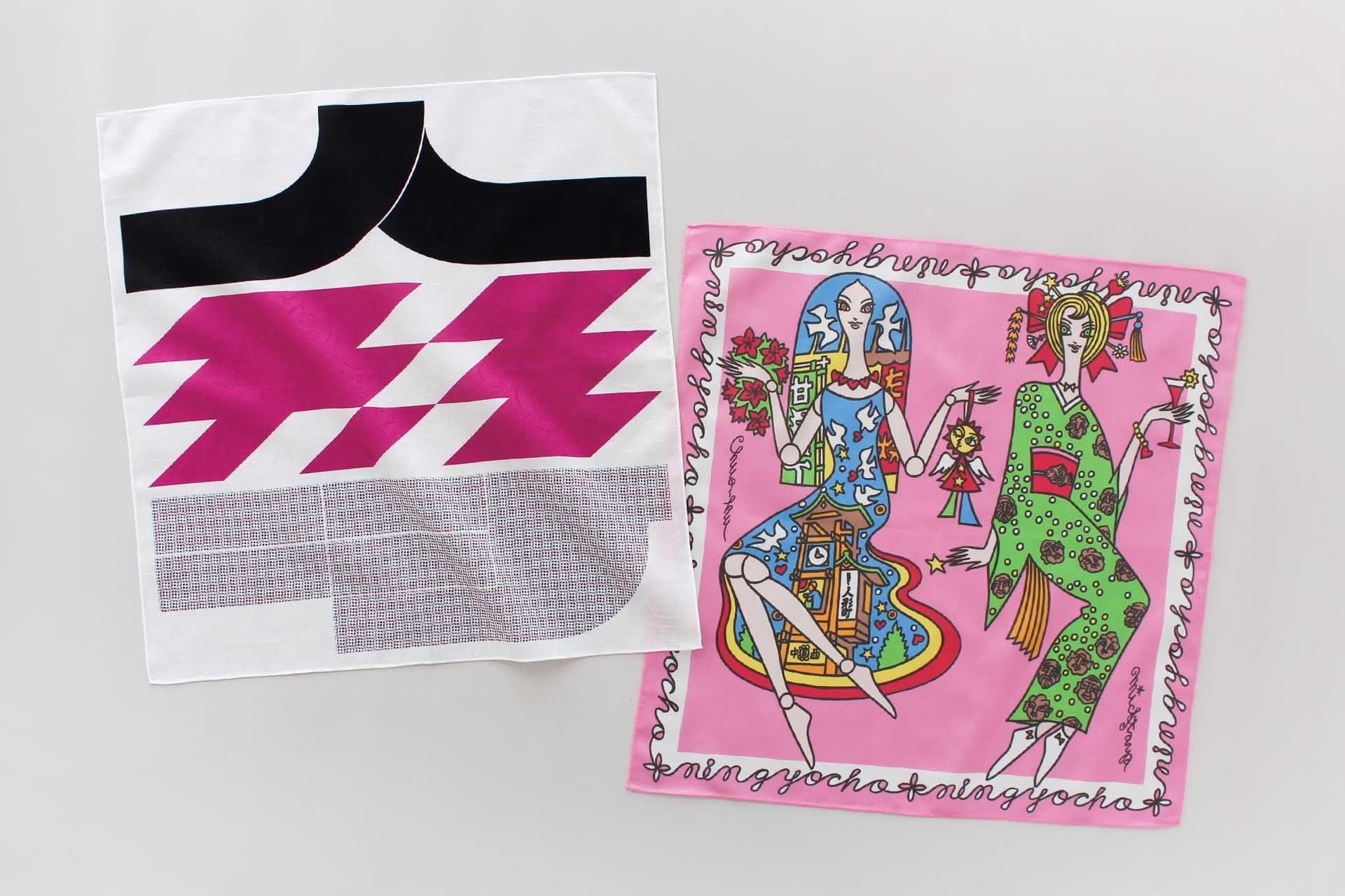「人形町」の文字をグラフィカルにあしらった一枚や、ビジュアルアーティストのミック・イタヤ氏が人形町にまつわるアイコンをイメージして描き下ろしたデザインなど、日本橋人形町店限定のハンカチーフをご用意しております。ご自身用にはもちろん、人形町を訪れた記念のアイテムとしてもおすすめです。