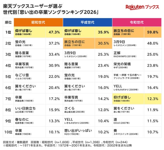 楽天グループ株式会社が運営するオンライン書店「楽天ブックス」は、3月の卒業シーズンに向けて、「楽天ブックス」ユーザー3,248名を対象としたアンケートを実施し、その結果をもとに「世代別 思い出の卒業ソングランキング2026」を本日発表しました。