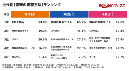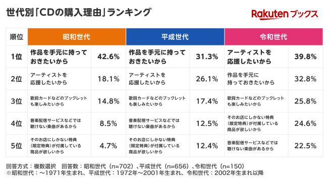 ・音楽の視聴方法は「昭和世代」では「CDを購入」が1位に。「令和世代」のCD購入理由は「アーティストを応援したいから」が最多