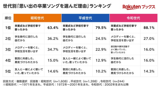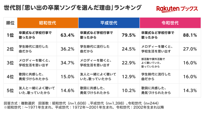 ・「思い出の卒業ソングを選んだ理由」1位は全世代で「卒業式など学校行事で歌ったから」。各世代からエピソードが集まる
